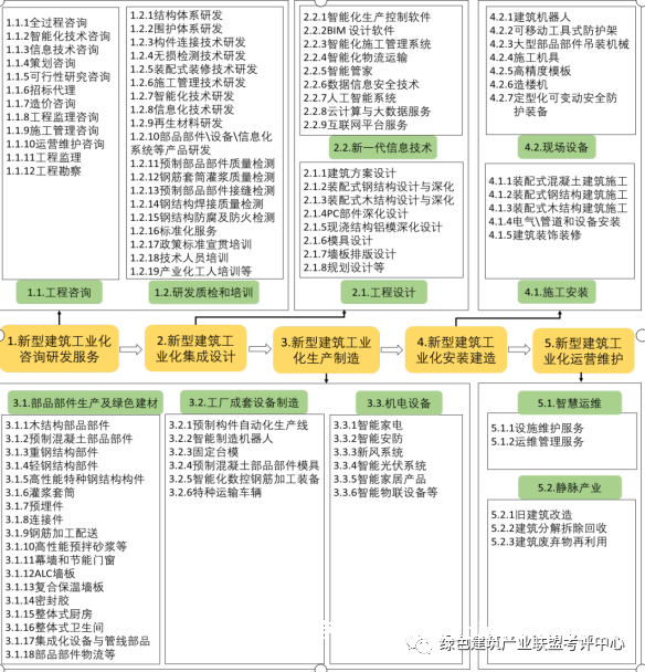 1.打造“5395”产业体系。从工程项目全寿命期视角梳理新型建筑工业化发展节点,深挖产业价值链,增强创新链,加强政府引导,鼓励企业参与,逐步构建和完善由5个项目阶段(咨询研发、集成设计、生产制造、安装建造和运营维护)、3个层级(项目阶段、细分行业、产品与服务)和95项核心产品与服务组成的“5395”新型建筑工业化产业体系。