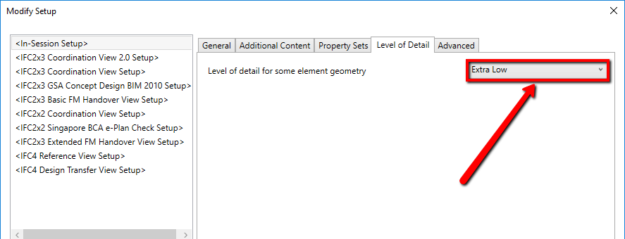 通过使用中描述的一种或多种技术减少视图中的几何体数量关于在导出前限制模型几何 。另一种技术是修改中的设置家庭几何可见性设置对话框使得不需要包含在导出文件中的族不会显示在视图中。