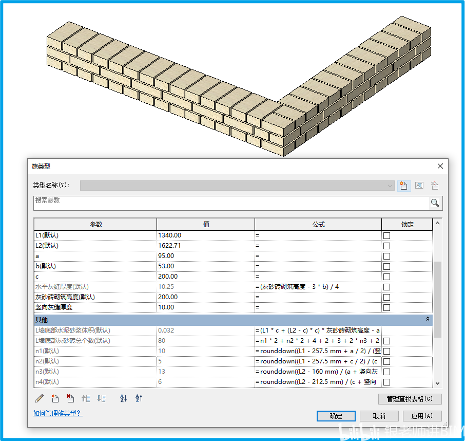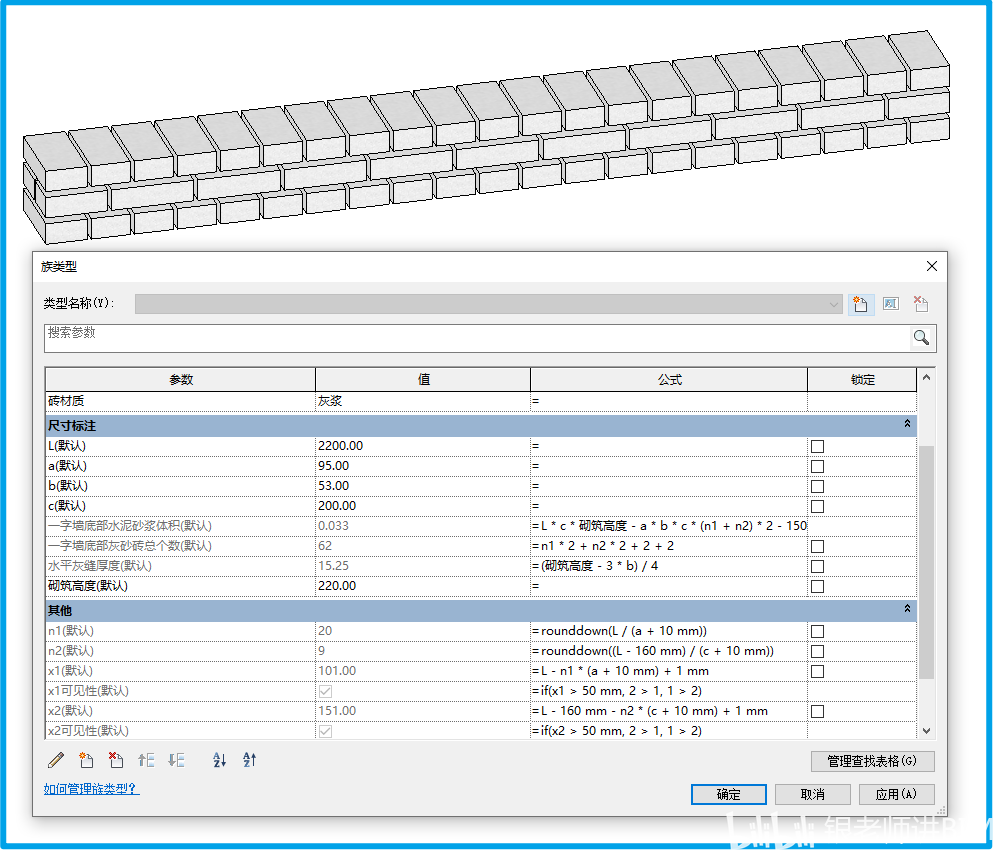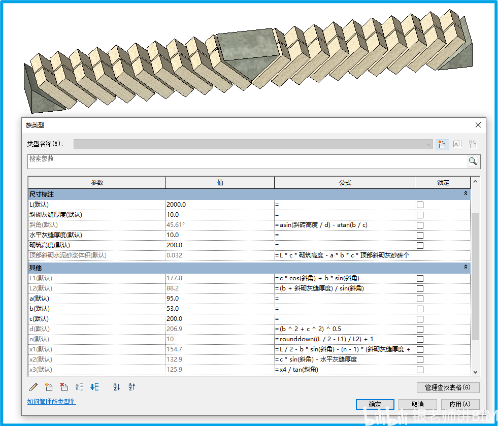 第一步:首先使用revit中的参数化族功能,做出通用的参数化嵌套族,这些族需要达到长度方向可以任意拉伸、高度可以调整的功能,并且这些族中砖的个数以及砂浆的体积可以在模型明细表中进行统计。这些族作出之后工作就变得一劳永逸了,整个公司的项目都可以使用,如下图所示,以顶部斜砌族和底部灰砂砖族为例向大家展示: