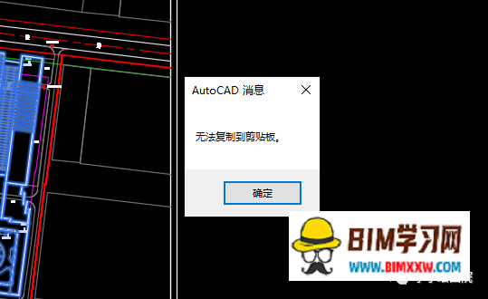 今天在套图的时候遇到了一个小问题,设计院发给我的项目规划图,我要套到我们的项目总图上去,在进行图形原位复制的时候出现了一个提示“无法复制到剪贴板”。如下图所示: