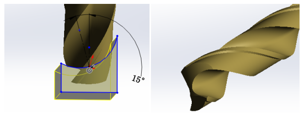 solidworks建模麻花钻实例(solidworks安装教程) 2023年11月1日Solidworks阅读模式 来看看效果先~~~ 钻头建模步骤: 第1步 利用拉伸或旋转完成主体圆柱建模 说明:圆柱直径为12,拉伸高度为140;并做1的边倒角 第2步 利用拉伸切除,草图中绘制截面,切出如图所示效果 第3步 对拉伸切除特征执行弯曲操作;弯曲角度为612度,长度为39;如下图所示 第4步 利用拉伸切除,对钻头头部做细节处理;如下图所示 第5步 将第4步切除做镜像或圆周阵列,生成另一侧效果 最终效果如下 点赞 https://www.bimxxw.com/soft/shenhua/solidworks/49290.html 复制链接 BIM学习群 微信扫一扫 微信公众号 微信扫一扫