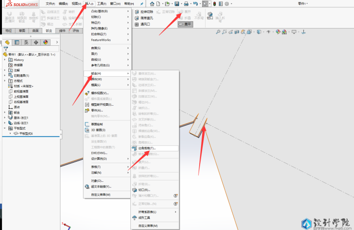 第3种:我们需要展开,然后点击插入,钣金,边角裁剪,选中边角的边线。