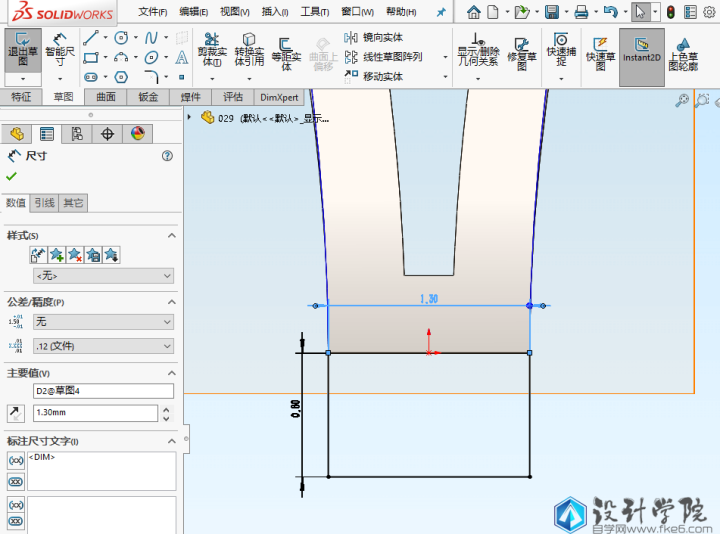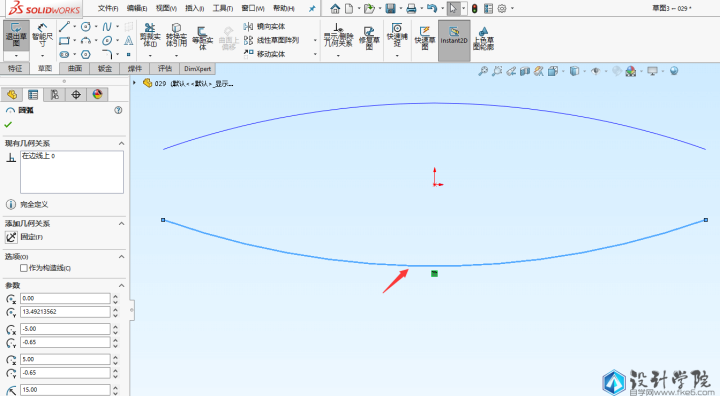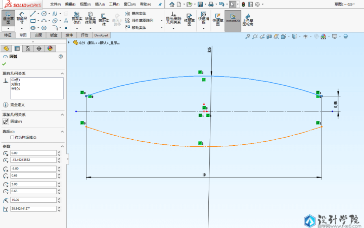 第1步,在上视基准面绘制草图如图,绘制一条中心线,画一段半径15的圆弧,距离中心线的距离为0.65。然后对其做镜向,镜向的圆弧切换为几何构造线,这段圆弧后面会用到。