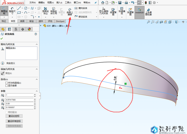 第7步:点击草图上的曲面上偏移,选择曲面,偏移的距离为0.5。