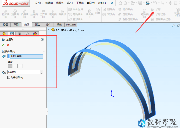 第9步:点击曲面里面的加厚,加厚的厚度为0.3。