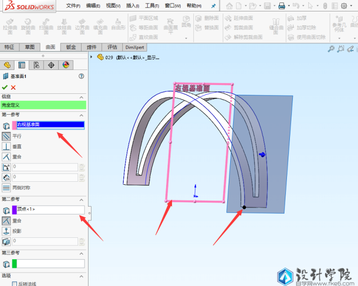 第8步:点击曲面剪裁,剪裁工具选择上一步曲面上偏移做的3D草图。点击移除选择,选择边界曲面。