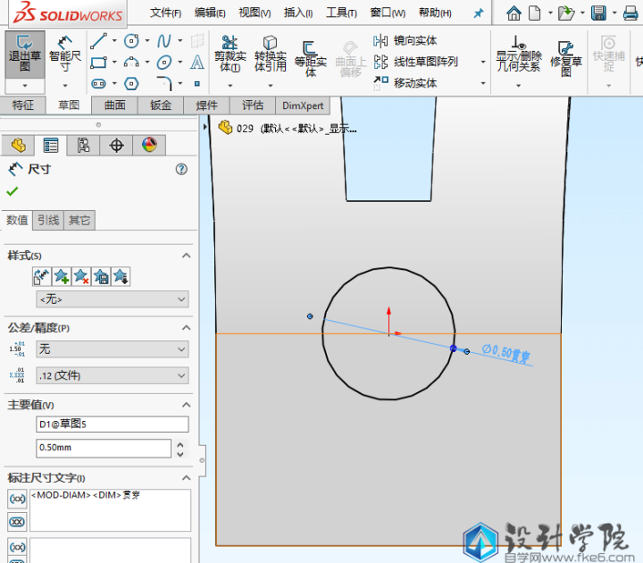 第12步,点击拉伸切除,还是在新的基准面上,绘制一个圆,直径0.5。切除一个孔,切除一个深度就行了。