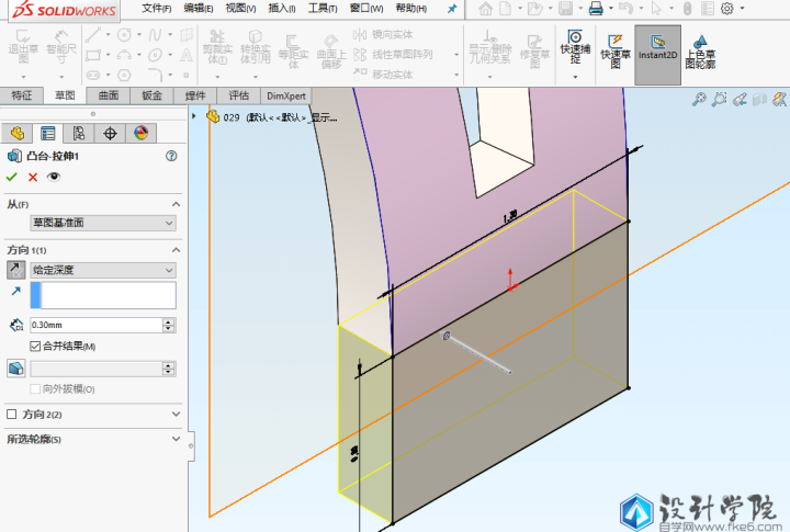 第11步:点击特征上的凸台拉伸,在新的基准面上绘制一个边角矩形,长度可以利用约束重合,宽度为0.6。拉伸的厚度为0.3,注意拉伸的方向。