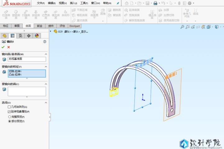 第13步:点击特征镜向,镜向基准面选择右视基准面,特征选择上面两步拉伸跟切除,就完成建模了。
