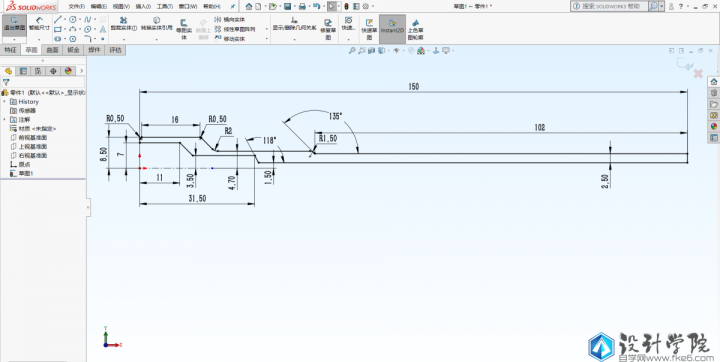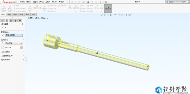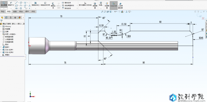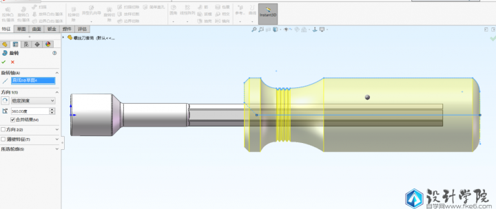 第4步,对手柄进行建模,点击旋转命令,还是在前视基准面上绘制旋转所需要的草图,这个草图比较复杂,要仔细标注好数据,完全定义草图。退出草图时选择以底边作为旋转轴。