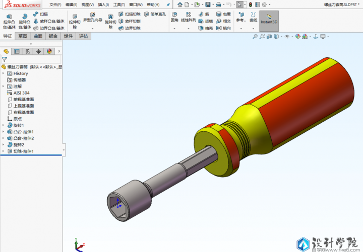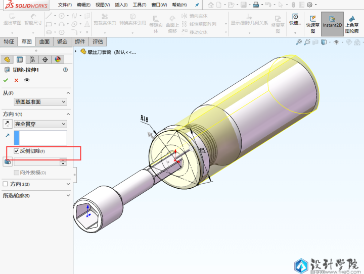 第5步,点击拉伸切除命令,选择手柄前面的平面作为基准面绘制草图,然后退出草图进行切除,这里注意要勾选反侧切除,终止条件选择完全贯穿。后面还可以给手柄简单的上个颜色。