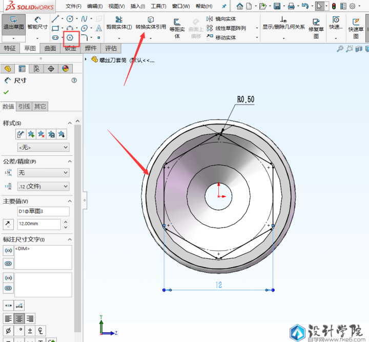 第3步,继续选择拉伸凸台,选择套筒的头部平面作为基准面,然后绘制草图,这里要注意转换实体引用外圆,同样还要做个小圆角。退出草图,终止条件选择成形到一面,选择粉红色那个圆锥面。