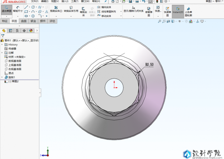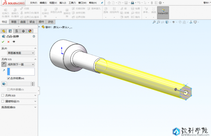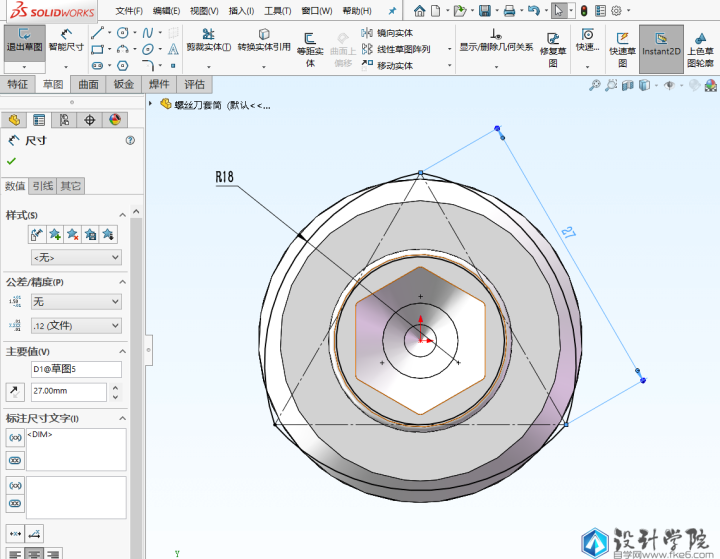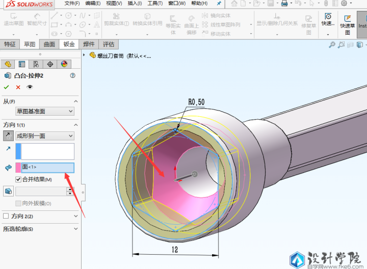 第2步,点击拉伸凸台,选择上一步的套筒尾部平面作为基准面,绘制六边形,做个小的圆角,然后退出草图,进行拉伸,终止条件选择成形到下一面。