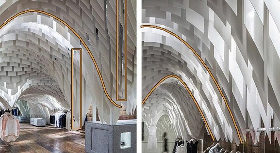 总设计师Francesco Gatti:"当我开始这个店铺的设计构思时,我只有一个简单却又引人入胜的想法,那就是所有的室内设计元素都将“从天而降”- 因此顾客将有充足自由的购物浏览空间而不被一般店铺底面中所摆放的家具和销售单品所阻碍。首先我们使用一个模型软件来模仿用材的物理特性,创造出一个可拉伸有张力的天花吊顶仿佛真实地被各类物件的重量所影响从而垂坠了下来。其次我们考虑到了店铺中所必须的一些设备例如照明、音响、消防喷淋、摄像头、空调和通风等,所以“可渗透”型的半开式吊顶外观想法则理所应当的浮出了水面。以上则是垂坠吊顶的创作本意,好似对转瞬即逝商品的片刻拥抱支撑。"