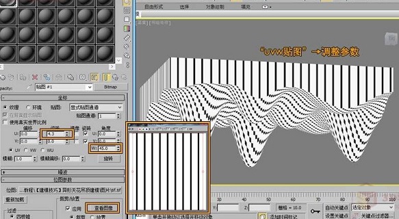 第三步,就是调整贴图了,在调整的过程中,我们都知道“黑透白不透”,调整的过程中,我们结合着贴图的参数及给模型一个“wuv贴图”命令来一起调整,黑色部分控制我们所需要的缝隙大小。