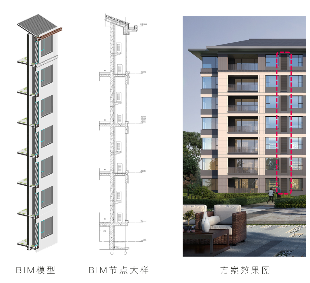通过BIM参数化设计,将复杂的搁板、凸窗、楼梯、阳台等构件置入立面设计之中,数字化驱动构件参数,匹配方案立面材质信息,减少返工情况,节省成本、缩短施工周期,确保立面效果完美落地。