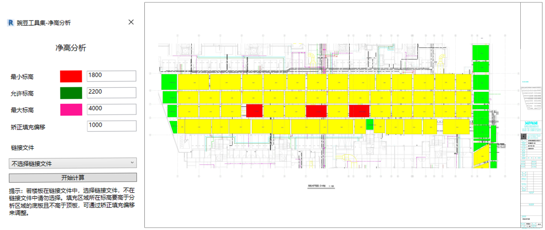 如面对项目地貌状况复杂、地库底板标高多、有多处斜板,现有软件无法满足项目净高分析的情况,设计团队研发了净高分析插件,确保每一块斜板处的净高都能满足要求。