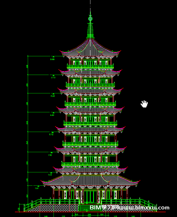 主要针对七层塔)。本工程(七层塔)采用钢筋混凝土屋面板;木装饰斗拱;出檐部分倒钉木屋面采用亚光黑琉璃瓦(带滴水勾头);一层栏杆采用青石栏杆,其余各层栏杆采用进口硬木。地坪为青色花岗岩,门窗采用古式门窗与黄铜大玻门窗结合(古式门窗固定)。七层塔设地下层,布置通道与九层塔(水中塔)相连。七层塔采用无机房电梯和黄铜结构楼梯上下(所有楼梯结点构造参见"96J435"钢梯国家标准图集)。